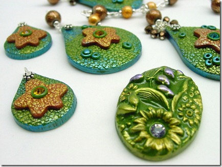 And a close up of the edge for the teardrop. Much better, but I still had to smooth the clay a little bit with my finger. I rather like the shape now. I used a lime and teal Viva Decor Inka Gold on these. I normally work in much darker colours, but thought I should try a little ‘lighter’ for Spring. Plus green goes so nicely with the popular Orange for this season.